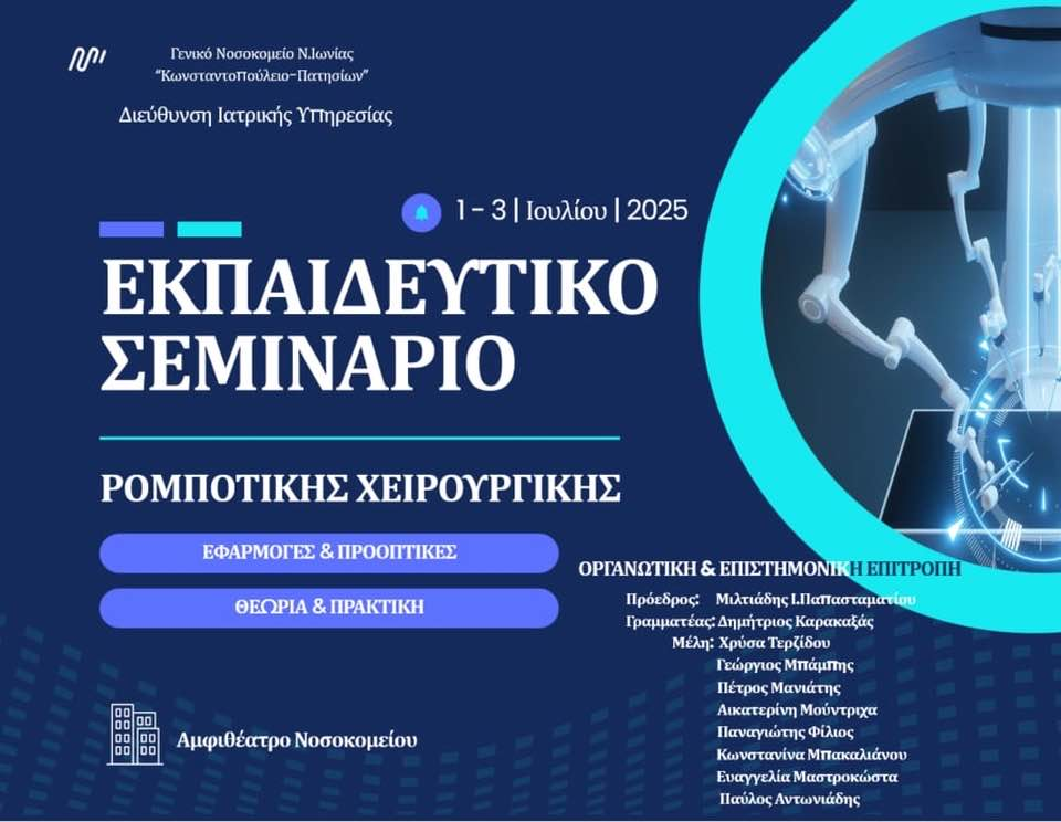 Με ιδιαίτερη τιμή και χαρά σας καλωσορίζω στο Εκπαιδευτικό Σεμινάριο Ρομποτικής Χειρουργικής, που διοργανώνει η Διεύθυνση Ιατρικής Υπηρεσίας του Γενικού Νοσοκομείου Νέας Ιωνίας “Κωνσταντοπούλειο – Πατησίων”, με τη συμμετοχή καταξιωμένων επιστημόνων και συναδέλφων από όλο το φάσμα του Χειρουργικού και Νοσηλευτικού Τομέα.